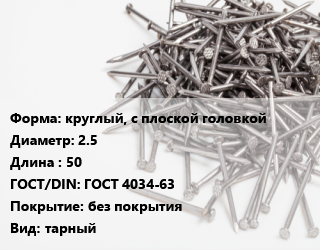 Гвоздь круглый, с плоской головкой 2.5х50 ГОСТ: ГОСТ 4034-63 без покрытия тарный